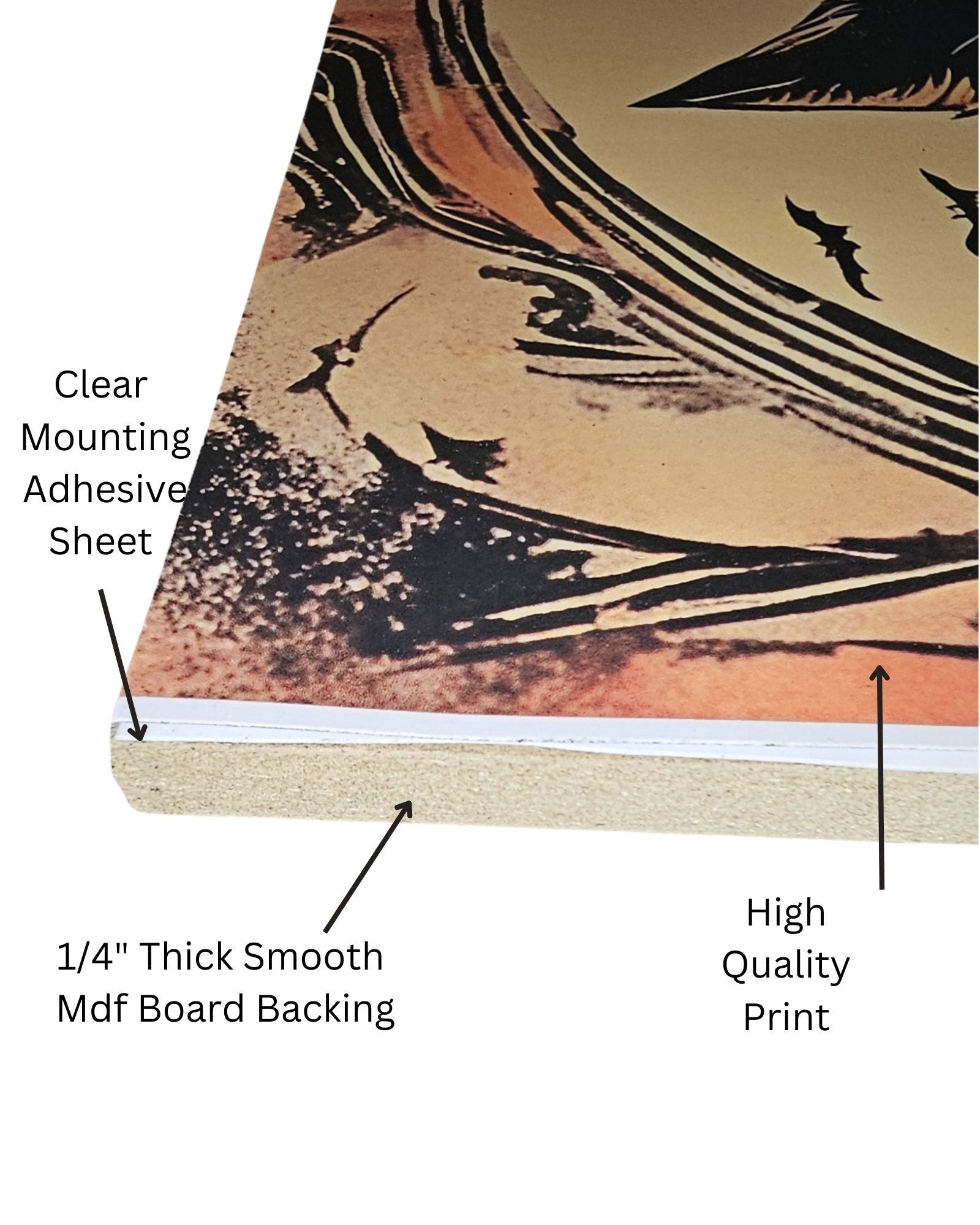 Square orientation. Printed on 235 GSM MOAB Matte Photo Paper. It is attached to a clear adhesive backing and then mounted on to smooth MDF backing board. The print is then permanently mounted to the frame with framing points.