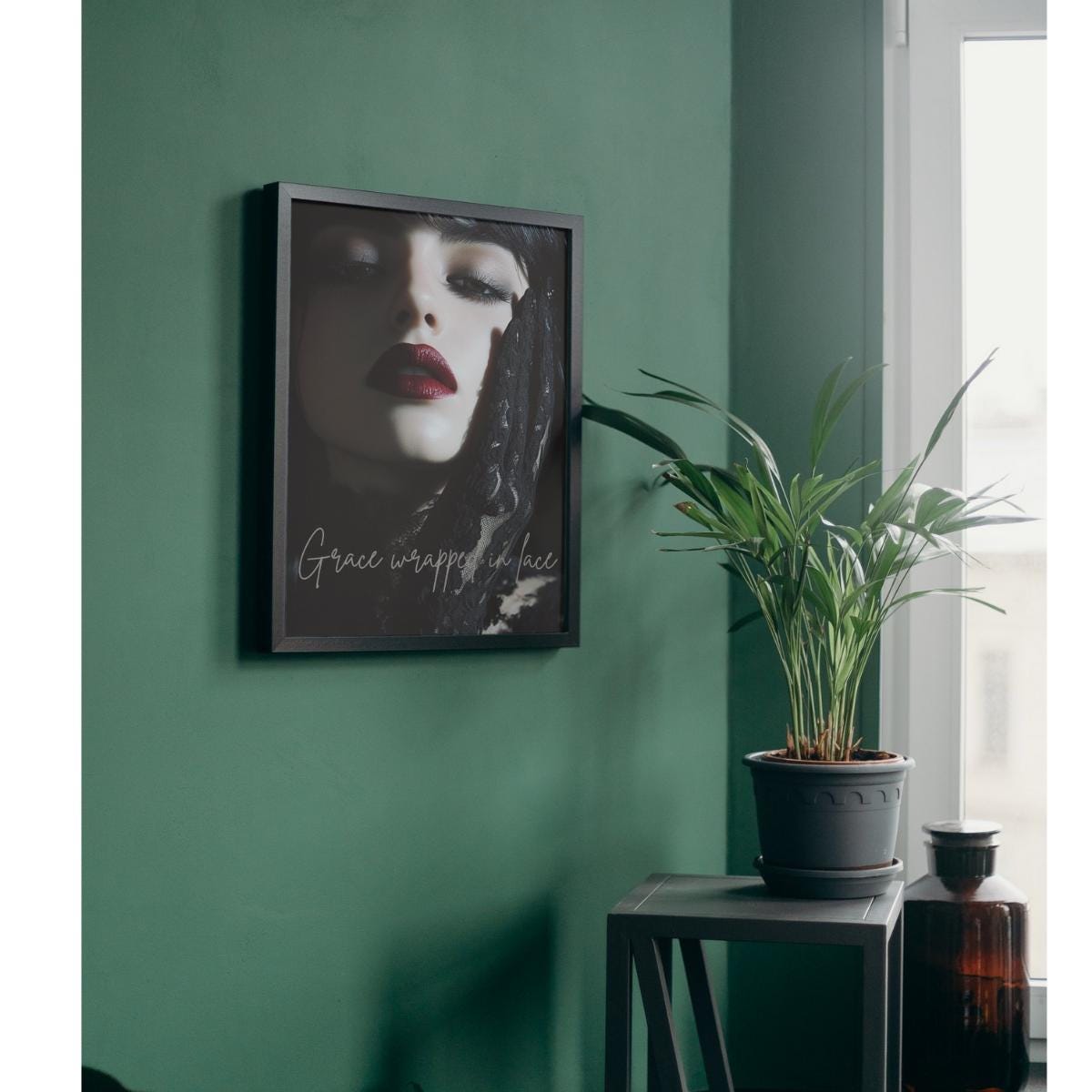 Step into the allure of the dark coquette aesthetic with our "Grace wrapped in lace " poster. The intricate patterns of the lace caress your skin, a delicate dance of shadow and light, perfect for those moments bathed in moody lighting. Dark red lipsticks rich, velvety hue whispers confidence.