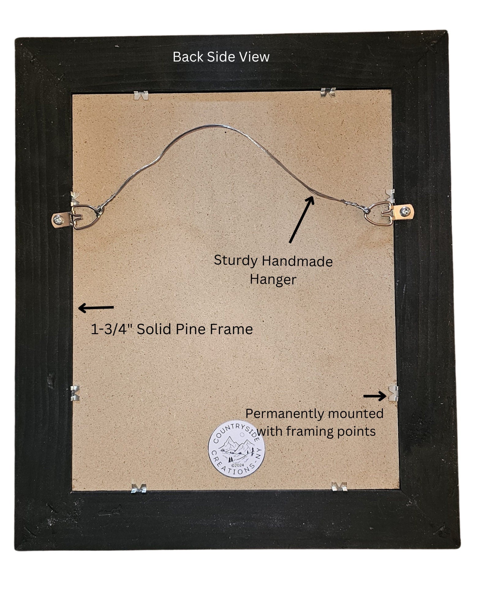 All materials are sourced with quality in mind. Each frame is made from hand selected pieces of pine. Cut, assembled, painted and finished in my shop. Prints are also designed/edited and printed by me. One of a kind art, made with pride!
